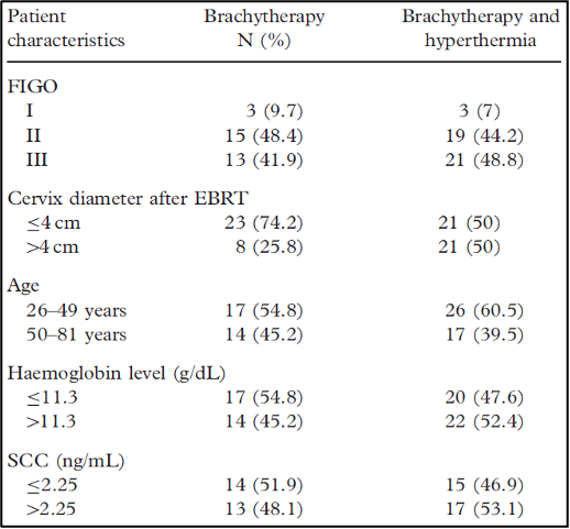 הגיל החציוני של החולים היה 49 שנים, וזמן המעקב החציוני של 76 המטופלים שנכללו בניתוח הסטטיסטי היה 43 חודשים (טווח 4 – 73 חודשים). בסך הכל 43 חולים טופלו בברכיתרפיה בשילוב עם היפרתרמיה. הבדלים משמעותיים לא זוהו בעבור FIGO, גיל, רמת המוגלובין או רמת סרטן תאי הקשקש בין שתי קבוצות הטיפול. למחצית מהחולים שטופלו בברכיתרפיה בשילוב עם היפרתרמיה הייתה תגובה ירודה של הגידול לטיפול קרינתי חיצוני (EBRT) עם קוטר גידול צוואר הרחם הגדול מ-4 ס"מ. כפי שתוכנן במחקר, קבוצת המטופלים בעלי הפרוגנוזה הגרועה טופלו בברכיתרפיה בשילוב עם היפרתרמיה. גידולים של צוואר הרחם בעלי נפח גדול (Bulky) אומתו רק ב-25% מהחולים שטופלו בברכיתרפיה בלבד. כל המטופלים קיבלו ארבעה טיפולי ברכיתרפיה מתוכננים.