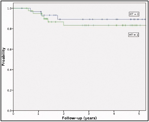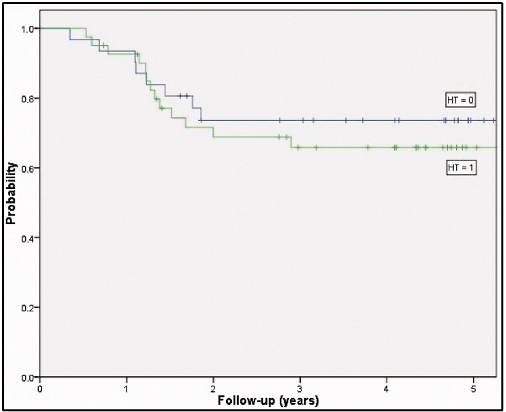 להלן איור 1: עקומות הישרדות ללא-מחלה המבוססות על שיטת הטיפול. HT = 0 (BT לבד), HT = 1 (BT בשילוב עם HT). HT- היפרתרמיה, BT- ברכיתרפיה.