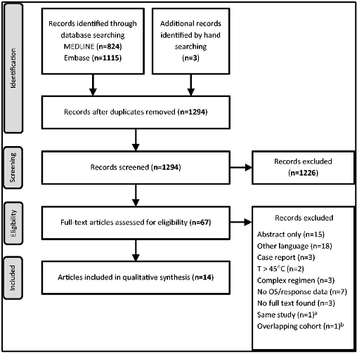 שיטות וחומרים: החוקרים ביצעו חיפוש ב-MEDLINE וב-Embase, בתוספת חיפוש ידני, של מחקרים קליניים המערבים היפרתרמיה בחולי סרטן הלבלב. איכות המחקרים הוערכה באמצעות Oxford Centre for Evidence-Based Medicine levels of evidence. התוצאה העיקרית הייתה יעילות הטיפול; החוקרים חישבו את שיעור התגובה הכולל ואת האומדן המשוקלל של ההישרדות הכוללת החציונית של האוכלוסייה (MP) והשוו אותם בין קבוצות ההיפרתרמיה והעוקבה.