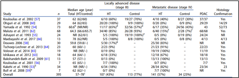 14 המחקרים שנכללו, שילבו כ-395 חולי סרטן הלבלב, שמתוכם 248 קיבלו היפרתרמיה (טבלה 1). שישה מתוך 14 מחקרים השתמשו באוכלוסיית ביקורת, שאפשרה השוואה בין טיפולים עם וללא היפרתרמיה. בשני מחקרים נכללו חולים עם מגוון קרצינומות, אך נתונים בעבור חולי הלבלב דווחו בנפרד.