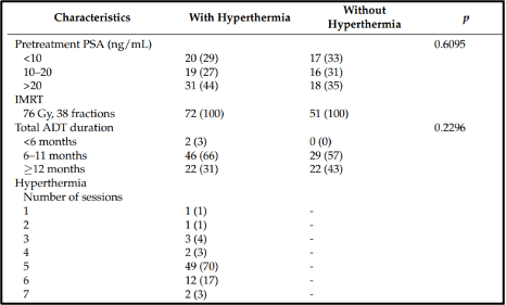 תוצאות – המספר החציוני של מפגשי טיפול החימום היה חמש והמינון התרמי הכולל החציוני של CEM43T90 היה 7.5 דקות. משך המעקב החציוני עמד על 64 חודשים. התוספת של היפרתרמיה לטיפול בקרינה מייננת בעלת עוצמה מאופננת (IMRT) ניבאה הישרדות קלינית טובה יותר ללא הישנות (clinical relapse-free survival). מינון תרמי גבוה יותר עם CEM43T90 (מעל ל-7 דקות) ניבא הישרדות ביוכימית טובה יותר ללא מחלות. ההיארעות של רעילות אקוטית ומאוחרת ≥ לדרגה 2, לא הייתה שונה באופן מובהק בין מטופלים עם היפרתרמיה או ללא היפרתרמיה.
