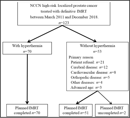 מטופלים עם קרצינומה של הערמונית בסיכון גבוה (n = 123), המוגדרים על פי ארגון חקר הסרטן העולמי (NCCN), טופלו בקרינה מייננת בעלת עוצמה מאופננת (IMRT) בין מרץ 2011 לדצמבר 2018, בבית חולים מוסדי. במהלך אותה תקופה, על פי פרוטוקול הטיפול של מוסד החוקרים, שמטרתו היא לשפר את התוצאות הקליניות, תת-קבוצה מבין המטופלים (70/123; 57%) קיבלה היפרתרמיה אזורית (regional hyperthermia) בשילוב עם טיפול בקרינה מייננת בעלת עוצמה מאופננת (IMRT) (איור 1); 53 המטופלים הנותרים טופלו בקרינה מייננת בעלת עוצמה מאופננת (IMRT) דפיניטיבית (definitive) בלבד. האינדיקציות העיקריות נגד השימוש בהיפרתרמיה אזורית היו כדלקמן: סירוב המטופל (n = 21), מחלות מוחיות (n = 12), מחלות קרדיווסקולריות (n = 8), מחלה אורתופדית (n = 5), הימצאות של מחלות אחרות (n = 4), וגיל מתקדם (n = 3). שניים מתוך 123 המטופלים לא הצליחו להשלים את המינון המתוכנן של הטיפול בקרינה מייננת בעלת עוצמה מאופננת (IMRT) (76 Gy ב-38 מקטעים) ולא נכללו במחקר. לפיכך, נתונים מ-70 מטופלים שטופלו בקרינה מייננת בעלת עוצמה מאופננת (IMRT) בשילוב עם היפרתרמיה אזורית, ומ-51 מטופלים שטופלו בקרינה מייננת בעלת עוצמה מאופננת (IMRT) דפיניטיבית בלבד, נותחו רטרוספקטיבית (איור 1). מטופלים עם קרצינומה של הערמונית לאחר ניתוח (postoperative prostate carcinoma) לא נכללו במחקר זה.