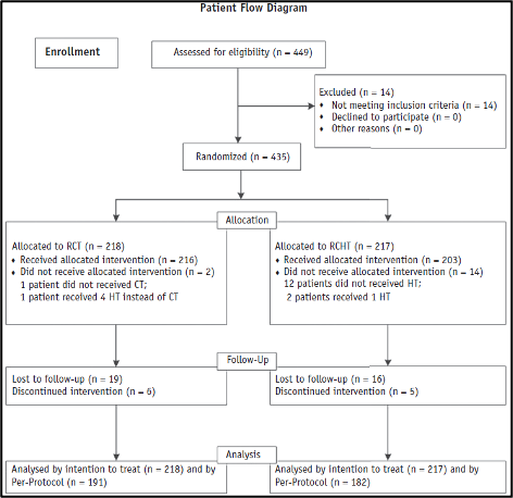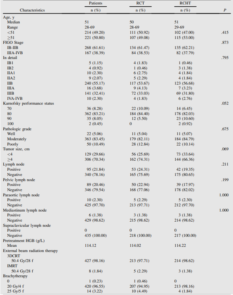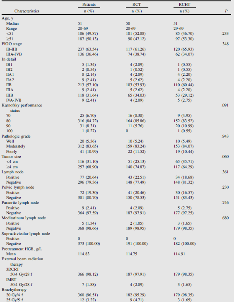 תרשים זרימה של החולים מוצג באיור 1. בסך הכל, 449 חולים עם סרטן צוואר הרחם גויסו לניסוי קליני זה, ו-14 חולים לא נכללו (2 חולים בעקבות אדנוקרצינומה צווארית שאושרה היסטולוגית; חולה אחד עקב סרטן ראשוני כפול; 10 חולים בגלל אי סבילות לטיפולים; וחולה אחד בעקבות ספירה נמוכה של תאי דם לבנים). ארבע מאות שלושים וחמישה חולים חולקו לשתי קבוצות טיפול על פי רשימת מספרים אקראיים שנוצרה על ידי מחשב: 218 לרדיוכימותרפיה ו-217 לרדיוכימותרפיה בשילוב עם היפרתרמיה. בסופו של דבר, 373 חולים השלימו את הטיפול שנקבע וסיימו מעקב של 5 שנים אחר הישרדות בפועל ורעילות הקשורה לטיפול, והשאירו 191 חולים בקבוצת הרדיוכימותרפיה ו-182 חולים בקבוצת הרדיוכימותרפיה בשילוב עם היפרתרמיה לביצוע אנליזה.