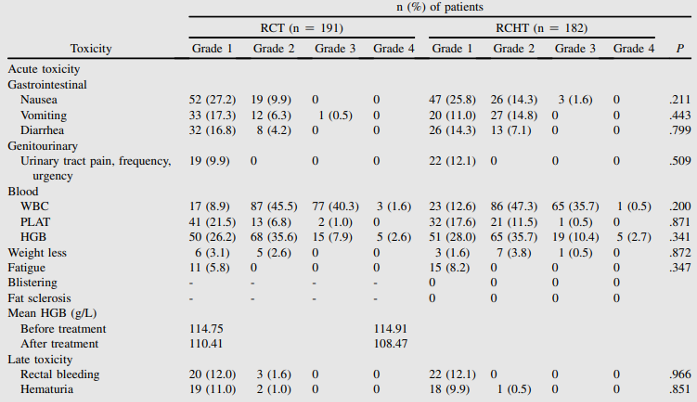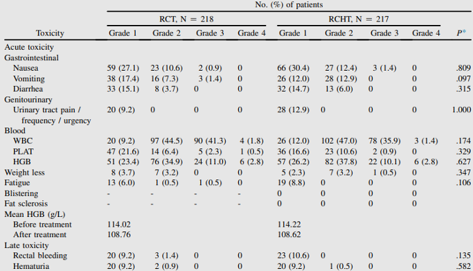 רעילות אקוטית ומאוחרת לאחר הטיפול מסוכמת בטבלאות 5 ו-6. הרעילות לא הראתה הבדל משמעותי בין 2 קבוצות הטיפול. בנתונים לפי פרוטוקול, הרעילות במערכת העיכול ובמערכת גניטורינארית הייתה בעיקר דרגה 1 או 2. רק 3 מטופלים חוו בחילות בדרגה 3 בקבוצת רדיוכימותרפיה בשילוב היפרתרמיה, וחולה אחד בקבוצת רדיוכימותרפיה חווה הקאות בדרגה 3. מעט חולים בכל קבוצה סבלו מרעילות דם בדרגה 4. אף מטופל בקבוצת הרדיוכימותרפיה בשילוב היפרתרמיה לא הראה תגובת שלפוחיות או סקלרוזיס של שומן הקשורה להיפרתרמיה. גם תופעות הלוואי המאוחרות והדרגות היו דומות בין שתי הקבוצות. 20 מטופלים (12%) ו-22 מטופלים (12.1%) סבלו מדימום רקטלי בדרגה 1 בקבוצות רדיוכימותרפיה והרדיוכימותרפיה בשילוב היפרתרמיה, בהתאמה. שלושה מטופלים (1.6%) בקבוצת רדיוכימותרפיה ואף אחד מהחולים בקבוצת רדיוכימותרפיה בשילוב היפרתרמיה לא סבלו מדימום רקטלי בדרגה 2. ל-19 מטופלים (11%) ו-18 מטופלים (9.9%) הייתה המטוריה בדרגה 1 בקבוצות רדיוכימותרפיה ורדיוכימותרפיה בשילוב היפרתרמיה, ו-2 מטופלים (1%) ומטופל אחד (0.5%) סבלו מהמטוריה בדרגה 2 בקבוצות רדיוכימותרפיה ורדיוכימותרפיה בשילוב היפרתרמיה, בהתאמה. לא הייתה המטוריה ודימום רקטלי בדרגה 3 ו-4 בקבוצת רדיוכימותרפיה או רדיוכימותרפיה בשילוב היפרתרמיה. בנתוני כוונה לטפל, התוצאות היו דומות לנתונים שלפי הפרוטוקול; הרעילות לא הראתה הבדל משמעותי בין 2 קבוצות הטיפול.