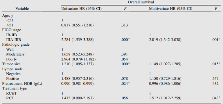 המחקר הנוכחי של החוקרים בחן בנוסף, גורמים פרוגנוסטיים אחרים המשפיעים על ההישרדות הכוללת בסרטן צוואר הרחם. מחקרים קודמים דיווחו על מספר גורמים פרוגנוסטיים. השלב הקליני, הסוג ההיסטולוגי, רמות ההמוגלובין והתפשטות לבלוטות הלימפה אושרו כמנבאים את הפרוגנוזה של סרטן צוואר הרחם. בהתבסס על נתוני הניסוי הנוכחי של החוקרים, שלב FIGO וגודל הגידול היו במתאם עם ההישרדות הכוללת של חולים עם סרטן צוואר הרחם באנליזת חד-משתנים ורב-משתנים (P < .001; P = .001 P < .001, P = .024 בהתאמה). עם זאת, גורמים פרוגנוסטיים אחרים, כגון בלוטות הלימפה חיוביות ורמות המוגלובין, לא היו במתאם באופן משמעותי עם הפרוגנוזה.